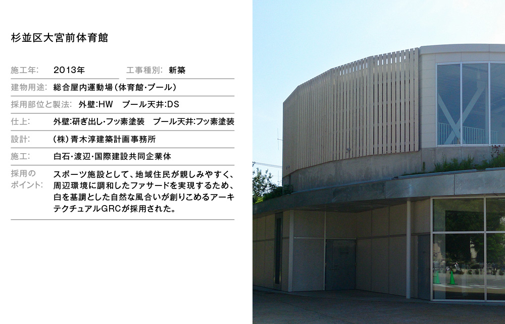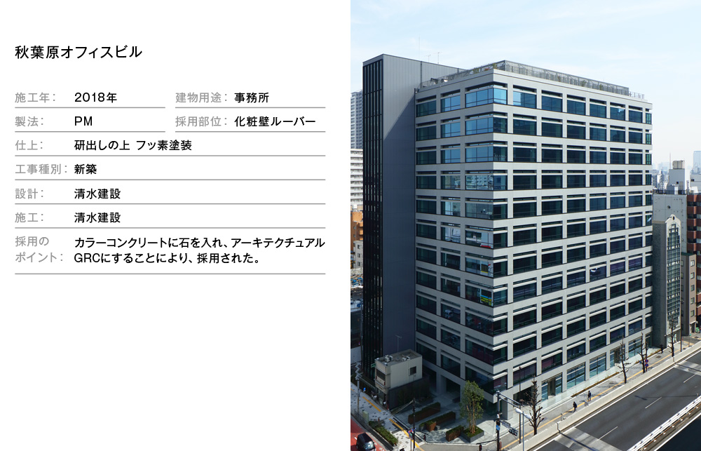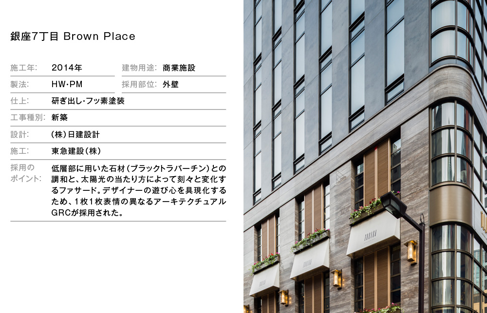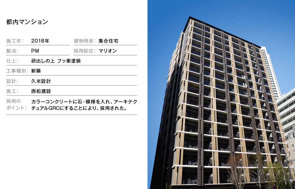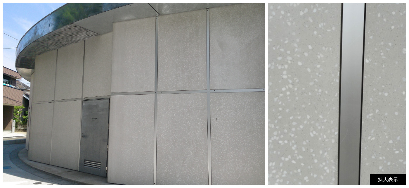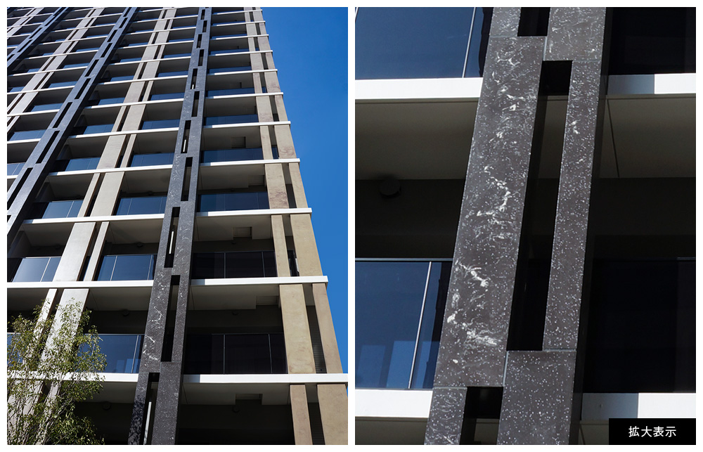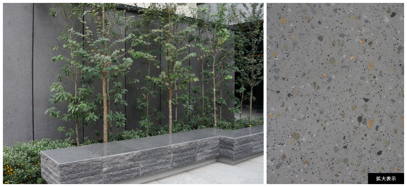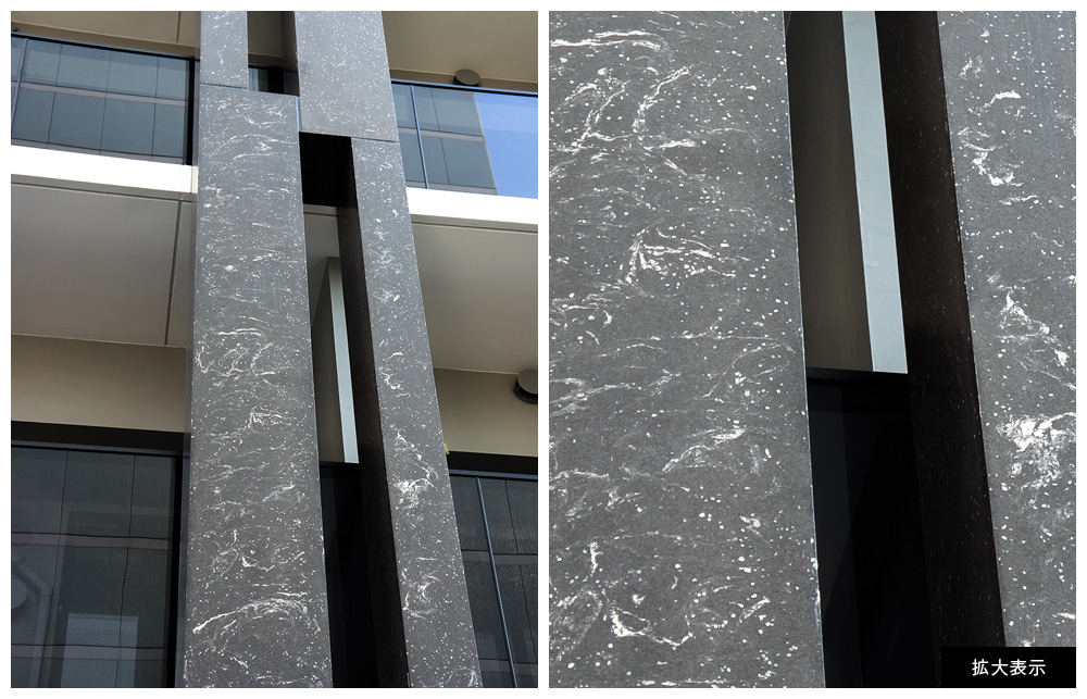 アーキテクチュアルGRCは、建築の意匠に独特の風合いをもたらします。外壁、マリオン、ルーバーなどに使用するコンクリートを素材からつくりあげることで、自然石の風合いや流れるような模様など、多彩な表現が可能になります。